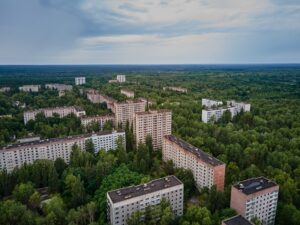Les environs immédiats appartiennent à ce que l’on appelle la zone d’exclusion. La ville abandonnée de Pripyat, qui abritait autrefois près de 50 000 habitants, est aujourd’hui une ville fantôme : les bâtiments envahis par la végétation, les écoles en ruine et la célèbre grande roue, qui n’a jamais été mise en service, sont les témoins silencieux des événements de 1986. Dans le même temps, la nature a reconquis de grandes parties de la région, avec une faune étonnamment diversifiée.