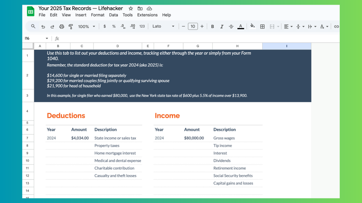Au lieu d’accepter la course annuelle, vous pouvez prendre de l’avance sur le jeu en utilisant une feuille de calcul pour suivre toutes vos informations sur l’impôt tout au long de l’année. Et il n’y a pas de meilleur moment pour commencer qu’à ce moment-là – lorsque vos connaissances fiscales sont fraîches comme cela peut être – pour faire votre feuille de calcul et commencer à exploiter les choses pour avril prochain.