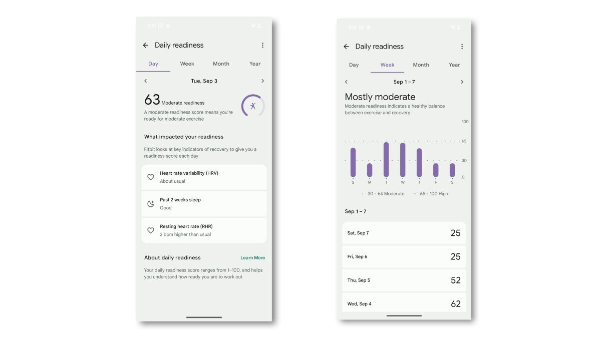 J’ai comparé le score de préparation de Fitbit à celui des appareils Oura et Garmin dans My Pixel Watch 3 Review. Il a donné des nombres plus faibles que ces appareils, et la tendance ne suivait pas particulièrement bien entre aucun d’entre eux. Par exemple, un jour où mon score de préparation calculé par Fitbit était de 65 ans, j’ai obtenu une préparation de 85 de l’Oura et une préparation à 79 de Garmin. Qui a raison? Personne ne peut dire.