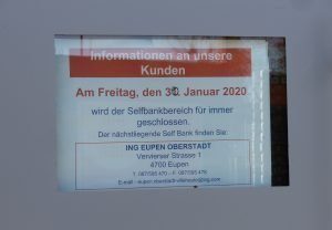 Remarque aux clients à l’occasion de la fermeture de la succursale ING dans l’Eupener Untertadt fin janvier 2020. Depuis lors, la ville inférieure n’a pas eu l’attrosnalité le mercredi 7 mai 2025. Photo: OD