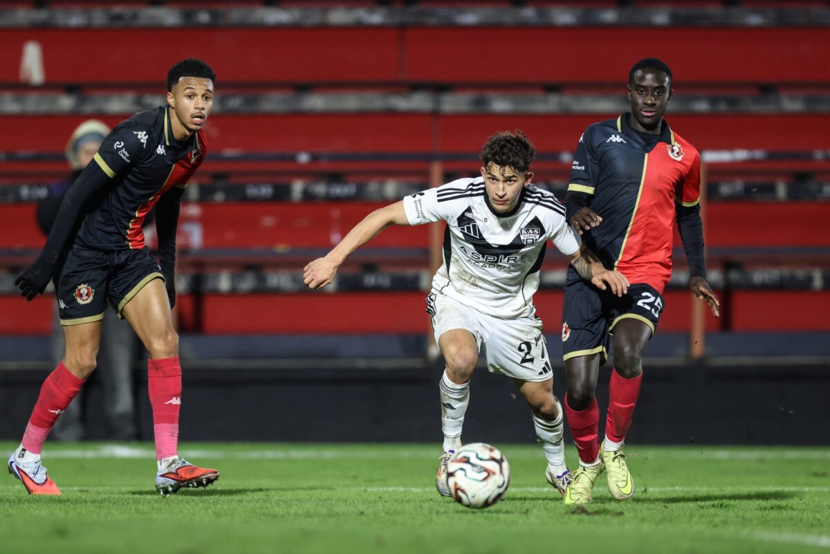 La formation de départ d’AS ressemblait à ceci : Hiller – Van Genechten, Paeshuyse, Plastun, Gavory – Möhwald, Busquets, Müller, Delaurier-Chautet – Nuhu, Atteri.