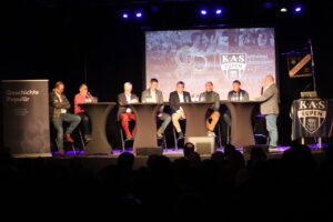 Table ronde à l’occasion de la remise du livre anniversaire le 2 décembre 2024 à l’Ancien Abattoir d’Eupen. De gauche à droite : Heinz Gensterblum, Günter Brüll, Elmar Keutgen, Frank Neumann, Ralph Lentz, Christoph Henkel, Elmar Brossel et le présentateur André Goebels. Photo : Patrick von Staufenberg