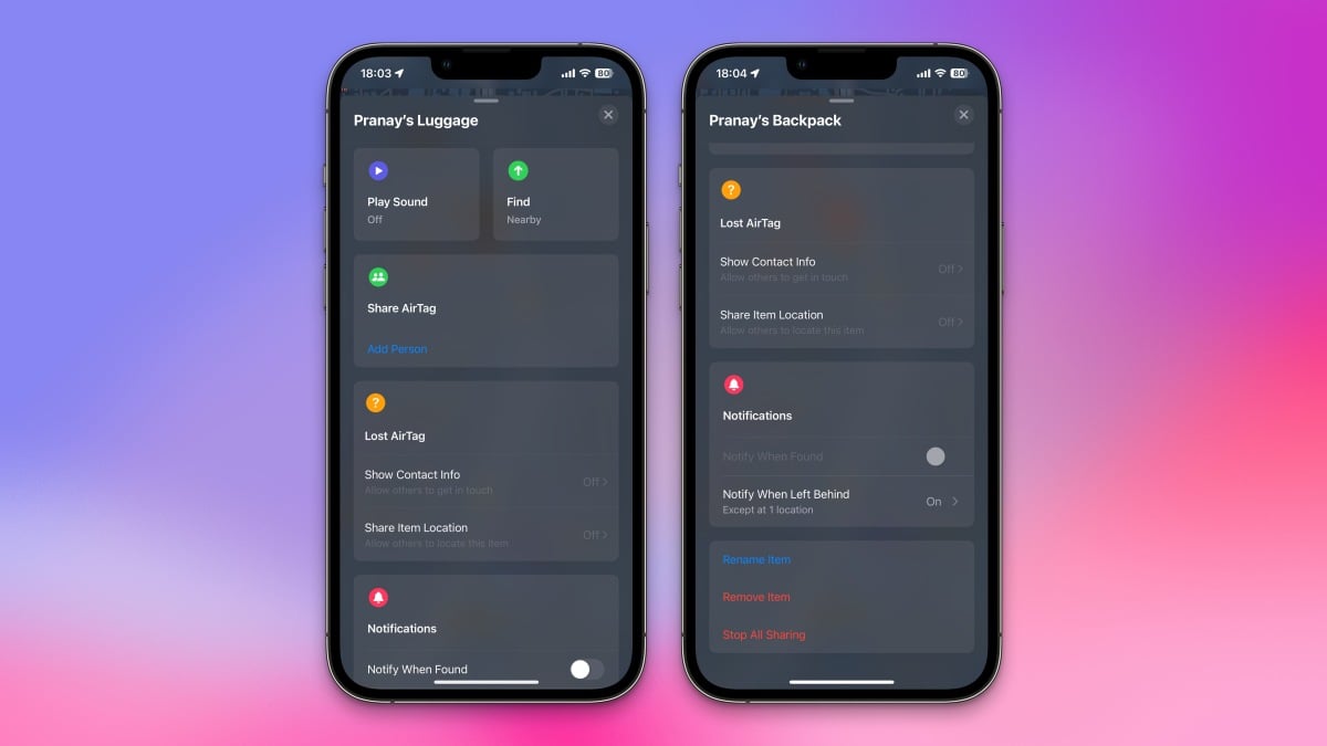 Cela semble évident, mais vous devriez vraiment renommer vos AirTags pour faciliter l’identification de chaque élément auquel ils sont attachés. Au lieu de les faire nommer « Pranay’s Airtags # 1, » Vous pouvez le changer en quelque chose comme « Pranay’s Blue Backpack ». Pour ce faire, accédez à la recherche de mon application sur votre iPhone et accédez à Éléments> AirTag> Renommer l’élément. Une fois que vous avez choisi des noms spécifiques et faciles à prononcer, vous pouvez essayer le conseil suivant.