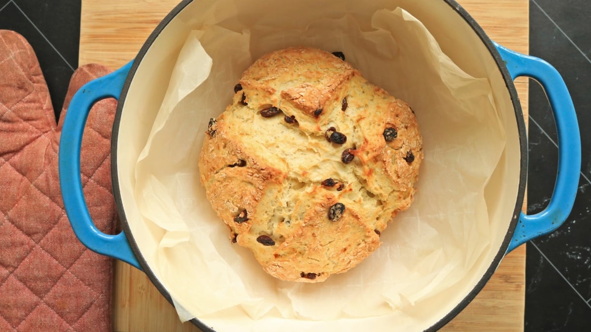 Le four hollandais est mon véhicule de choix pour ce pain de soda irlandais élevé et tendre. Semblable à la cuisson d’un pain au levain, l’humidité est l’ami de votre pain à soude. Encasser votre pain de soude dans un petit espace permet à l’humidité de s’accumuler à mesure que l’humidité s’évapore de la pâte. L’air humide maintient la surface du pain flexible plus longtemps que si vous l’ouvrez sur un plateau en feuille. La flexibilité supplémentaire signifie que le pain peut s’élever, sans inhibition par une croûte dure.