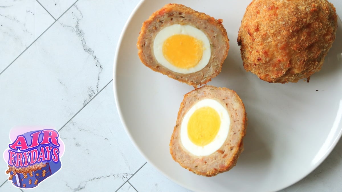 La teinture des œufs durs pour Pâques a fière allure (et c’est amusant!), Mais j’ai une meilleure décoration pour vos œufs cette année: la saucisse. L’œuf de scotch est probablement le plus succulent des préparations d’œufs durs. Bien que normalement frit pour garder sa forme dodue, vous pouvez maintenant le faire avec moins d’huile et moins de gâchis dans la friteuse à air. Voici ma recette pour les œufs scotch croustillants et juteux.
