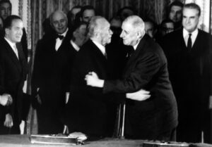 Parce que devant De Gaulle, deux autres grands Français avaient déjà remis leur main à « l’ennemi héréditaire »: Jean Monnet et Robert Schuman, les architectes de la communauté européenne pour le charbon et l’acier, fondé en 1951, le précurseur de l’Union européenne d’aujourd’hui. Et en 1957, les contrats romains ont été signés, ce qui justifiait la communauté économique européenne (CEE). Cela avait permis de serrer la coopération d’adenauer avec le Premier ministre français de l’époque, Guy Mollet, qui est complètement oublié aujourd’hui.